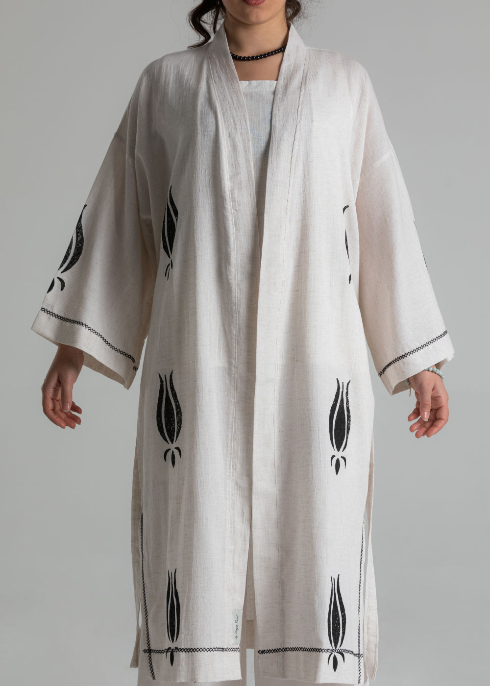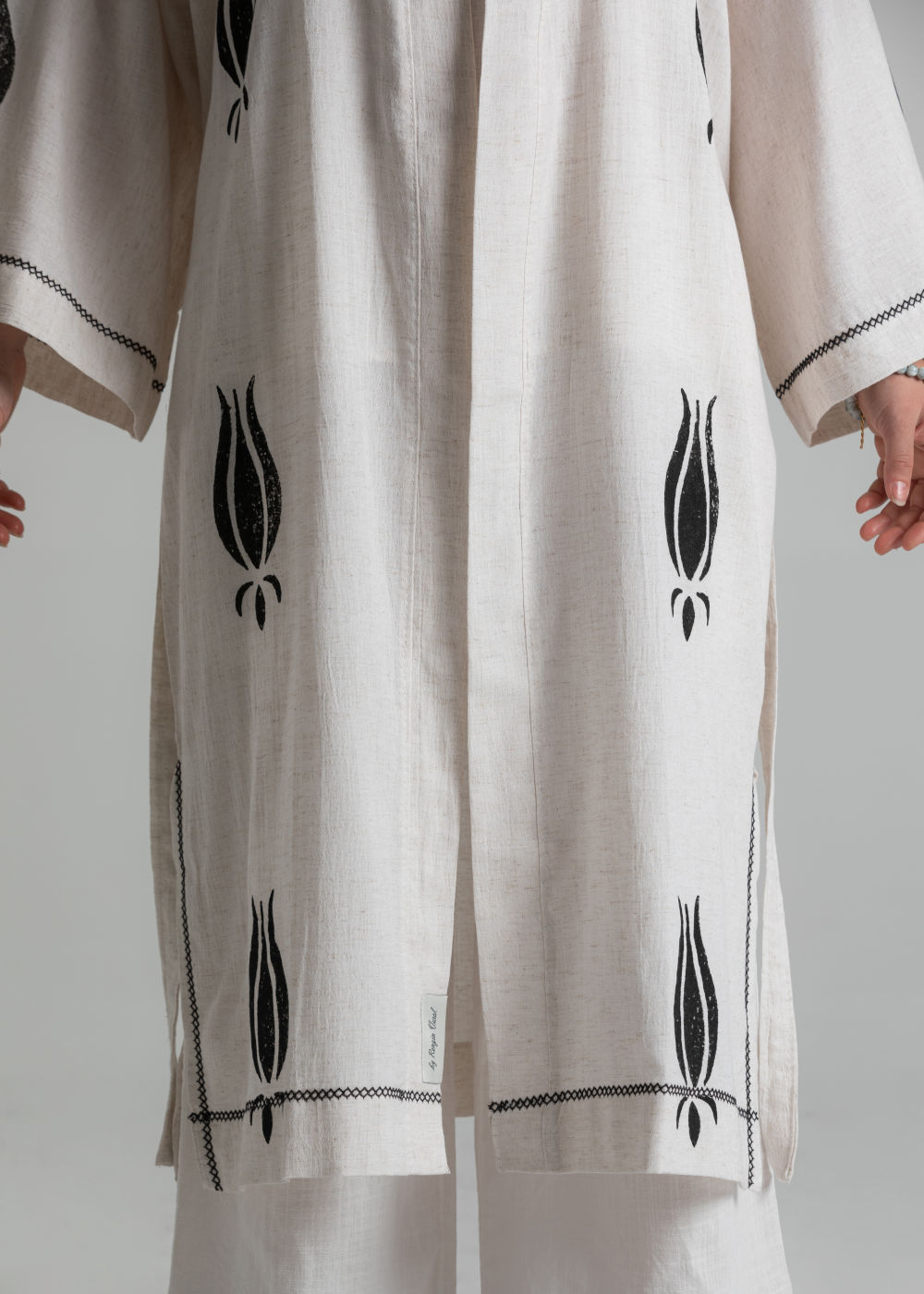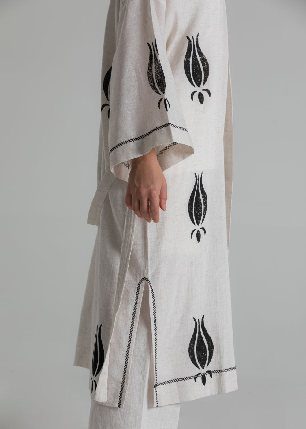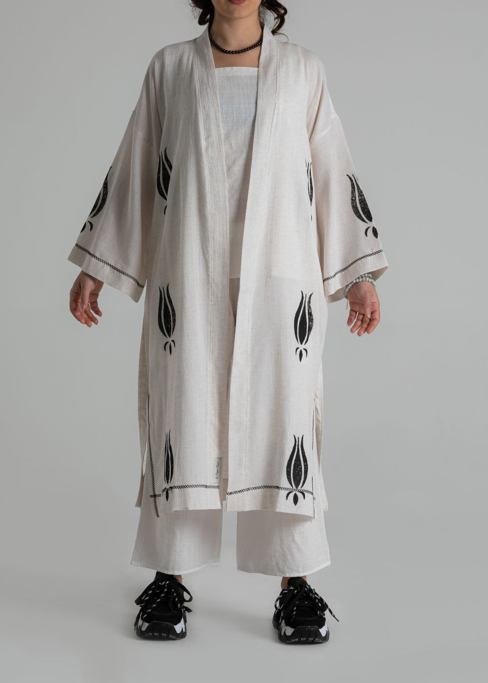 Çiçek Desen Nakış Detaylı Taş Baskı Kaftan Krem