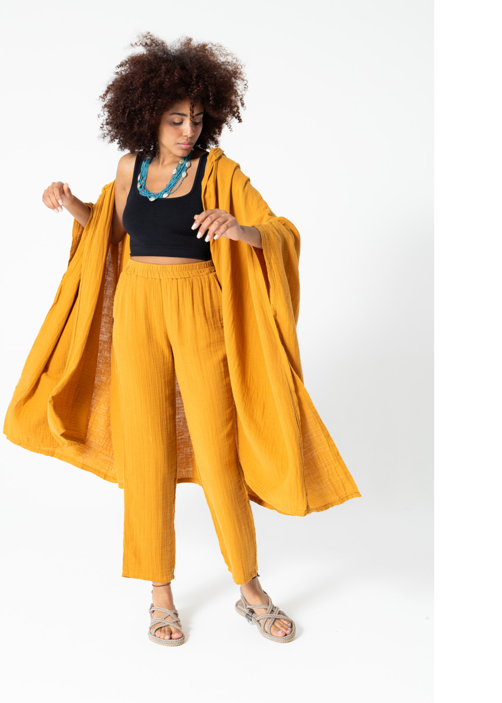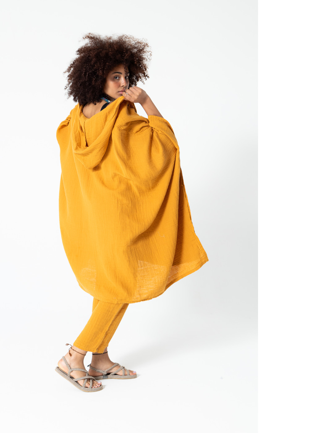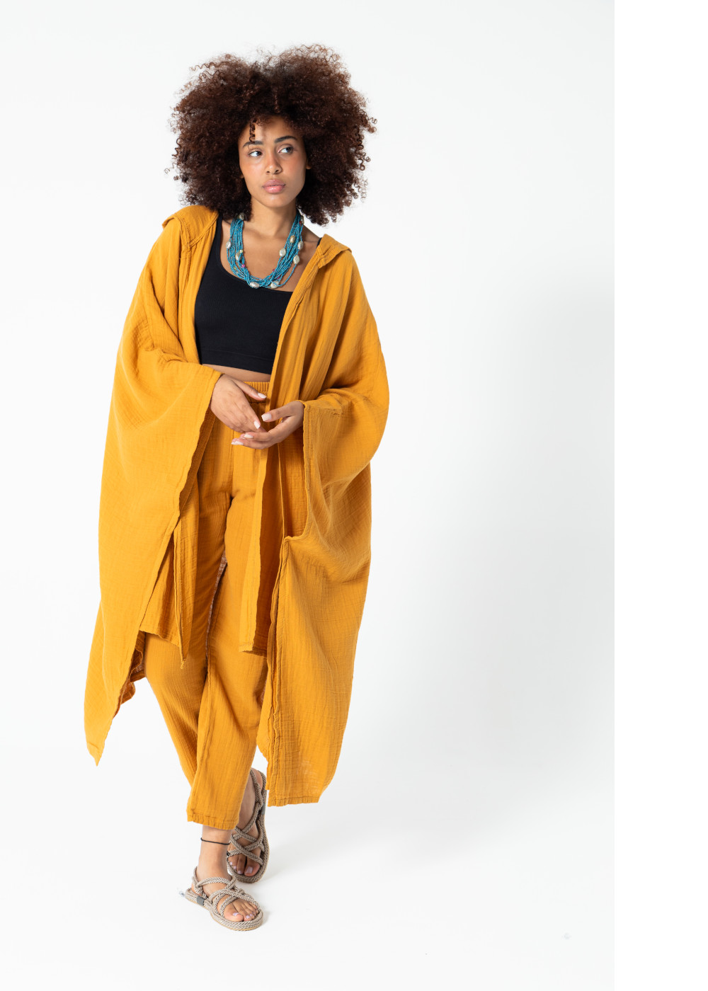 Müslin Kapüşonlu Kaftan Hardal